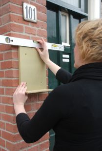 Je bevestigt de achterplaat met 4 schroeven aan de gevel van je huis. Je hangt het kistje op de achterplaat en je kunt het er ook eenvoudig weer af halen, zodat je de inhoud kunt veranderen. Het zit ook nog met een schroef vast zodat voorbijgangers het niet zo maar open kunnen maken. De voorkant is van 4 mm dik glas. Je kunt beter geen kostbare voorwerpen in het kistje plaatsen.